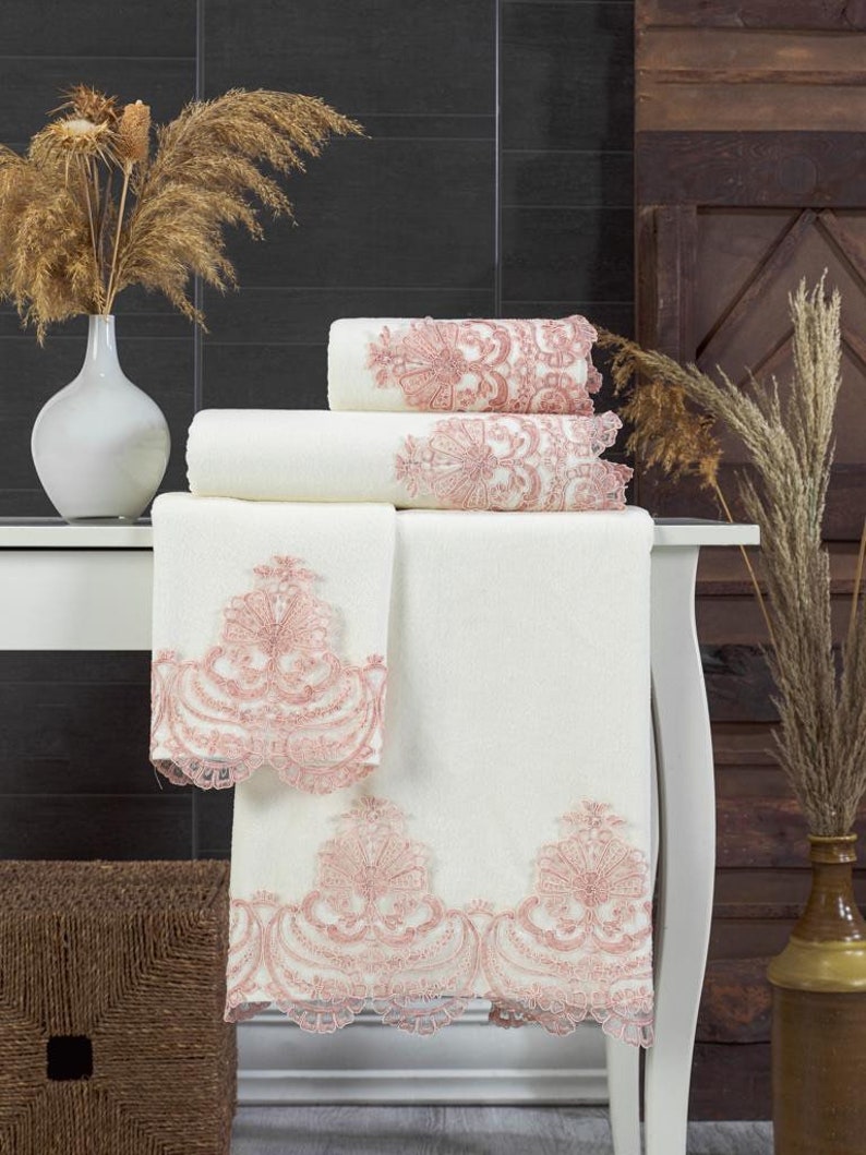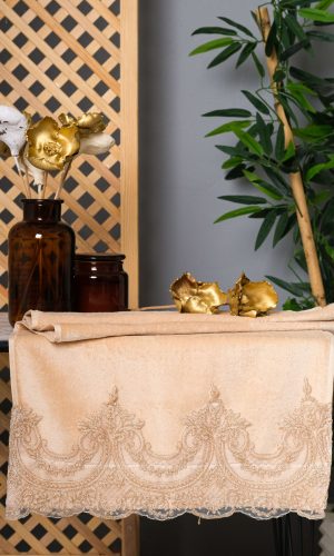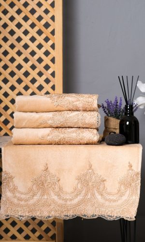Each towel is made from 100% velvet cotton, offering exceptional softness, absorbency, and durability. The royal cream base combined with delicate pink lace trim creates a warm and elegant look, ideal for weddings, housewarmings, or luxury bathroom decor.