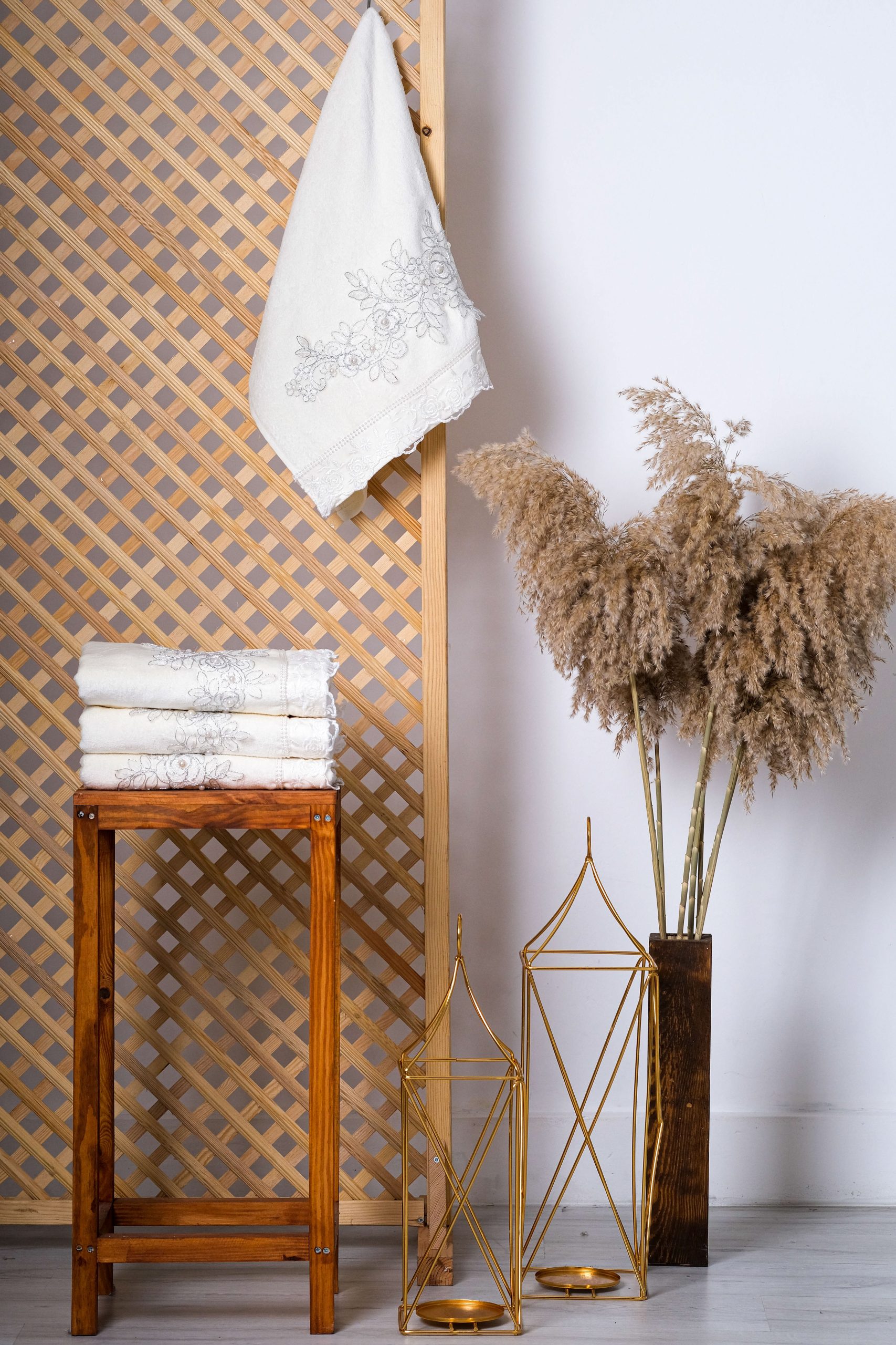 Add refined elegance to your bathroom with this luxurious hand towel set featuring detailed silver-thread floral embroidery on a cream velvet-cotton base. Expertly crafted in Turkey, these towels offer a plush feel, superior absorbency, and long-lasting durability.
